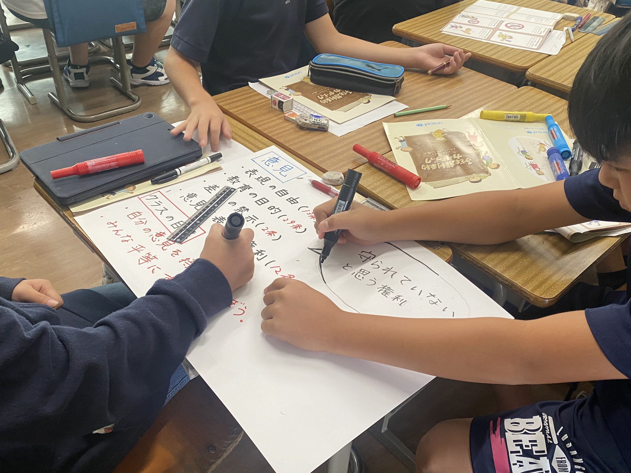 次にグループに分かれ、「子どもの権利を守り、自分のクラスをもっと良くするためのクラス目標」について話し合いました。「話し合いスタート!」の合図ですぐに活発に意見交換をしたり、役割分担をしたりしていました。普段の学校での小さな出来事を例に挙げながら、この日学んだばかりの子どもの権利条約をどう活かせば良いかを真剣に話し合っているグループが多く、とても興味深かったです。「差別なく、自分の意見をちゃんと言えるクラス」「絶対にクラスで差別をしない!!」「学習が進むように個人個人が意見を出し合って学習を進める」など、素晴らしいクラス目標がたくさん出ました。画用紙へのまとめ方や発表の仕方もとても上手で、私たちもとても勉強になりました。