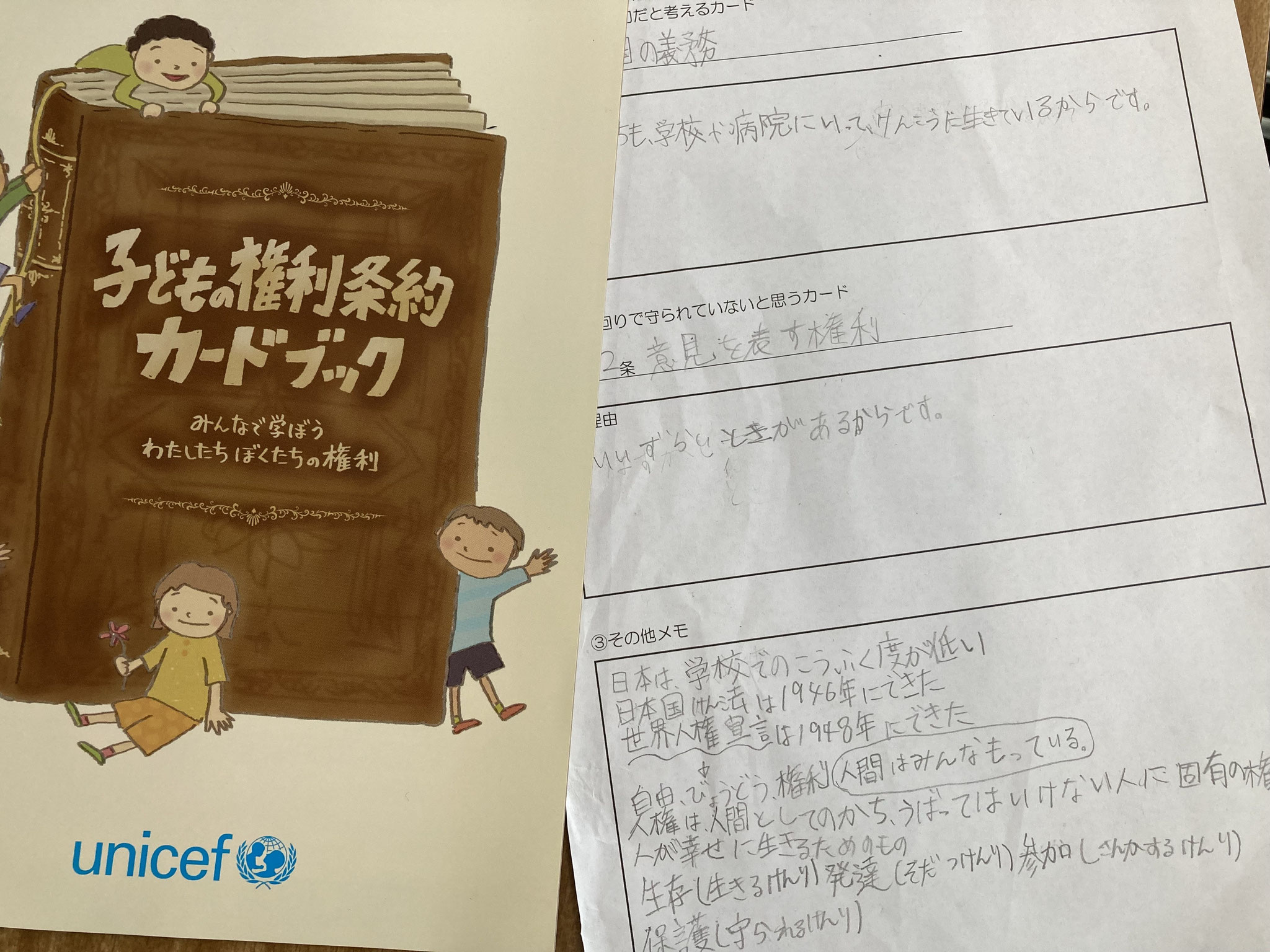 次は発表の時間です。この学校でも、授業の数日前に子どもの権利条約のカードブックを配布し、①自分が最も大切だと思う権利は?②自分の周りで最も欠けていると思う権利は? という2つの質問に、理由とともに回答を考えてもらっていたので、それを一人づつ全員に発表してもらいました。この学校では、選んだ権利が特に様々でしたが、①は『生きる権利・育つ権利』『休み、遊ぶ権利』『誘拐・売買からの保護』②は『差別の禁止』『意見を表わす権利』を選ぶ子が多かったようです。①で『休み、遊ぶ権利』が大切だと発表してくれた子は、「放課後は宿題があったり、休日はスポ少などで忙しかったりするので、もっとゆっくりしたいから。」という理由を話してくれました。